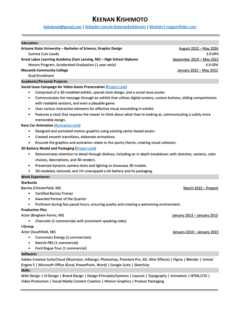 Keenan Kishimoto graduated from Arizona State University with a Bachelor of Science in Graphic Design. He is dedicated to evolving his work through creative thinking and a strong understanding of design principles. Whether he’s creating print or digital designs, developing layouts, or visual systems, Kishimoto delivers work that is professional and visually engaging. He is also passionate about animation, using motion graphics to enhance and expand his design work.