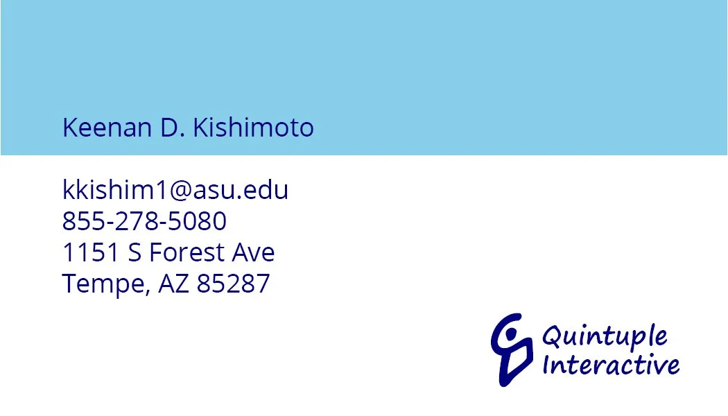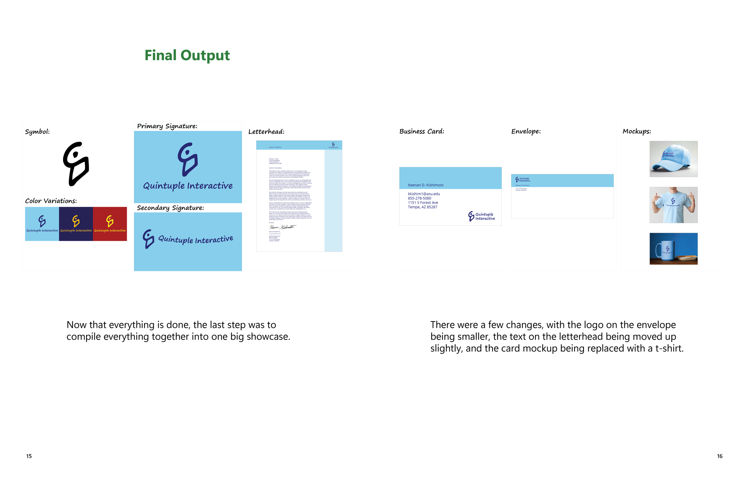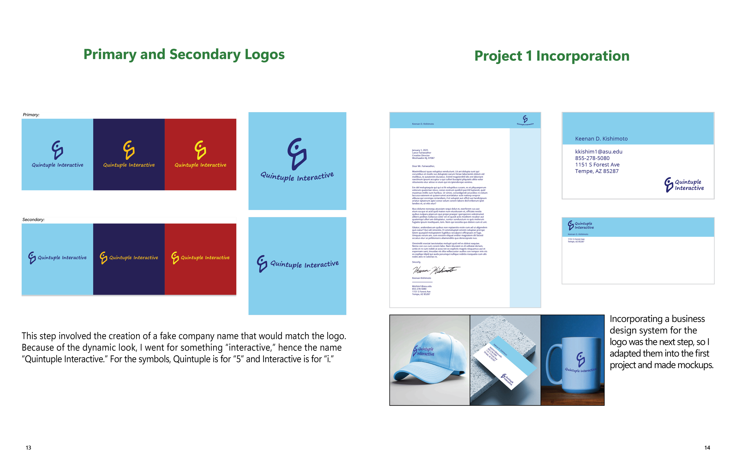 This business system features a unified and well-defined brand identity, encompassing a business card, letterhead, envelope, and both primary and secondary logos. Additionally, a comprehensive booklet is included, outlining the design process in detail. Please note that Quintuple Interactive is a fictitious organization created solely for the purposes of this project.