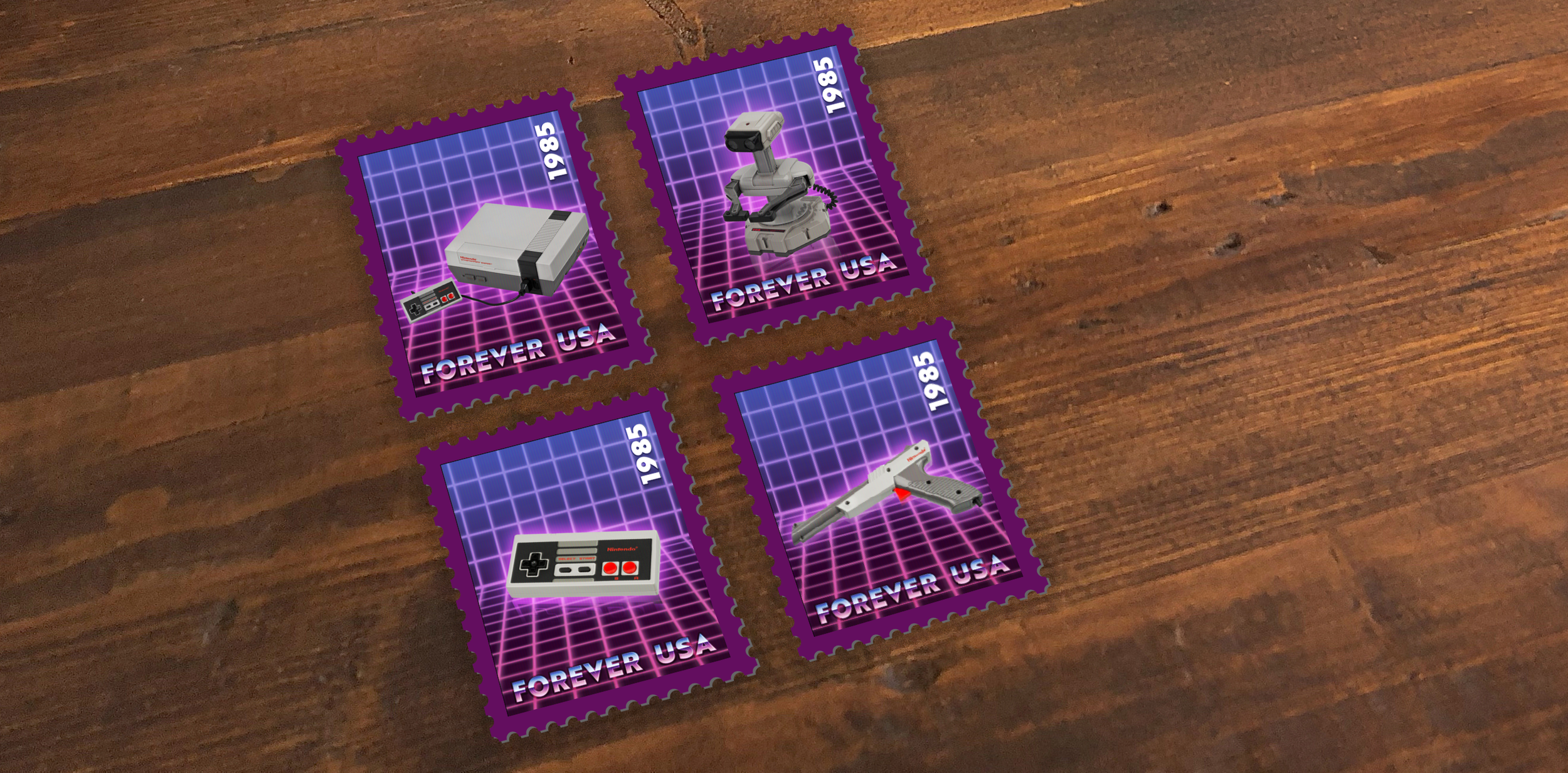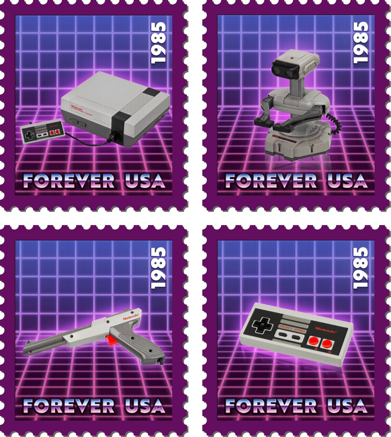 A commemorative stamp collection celebrating the iconic Nintendo Entertainment System—an ’80s-era console that revolutionized the gaming industry.